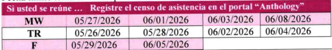 - 15 de mayo: Fecha límite para que los profesores reporten estudiantes que dejaron de asistir en las últimas 3 semanas (Informe UW) (nota: Estas 3 semanas son del 4 de mayo hasta el 21 de mayo)