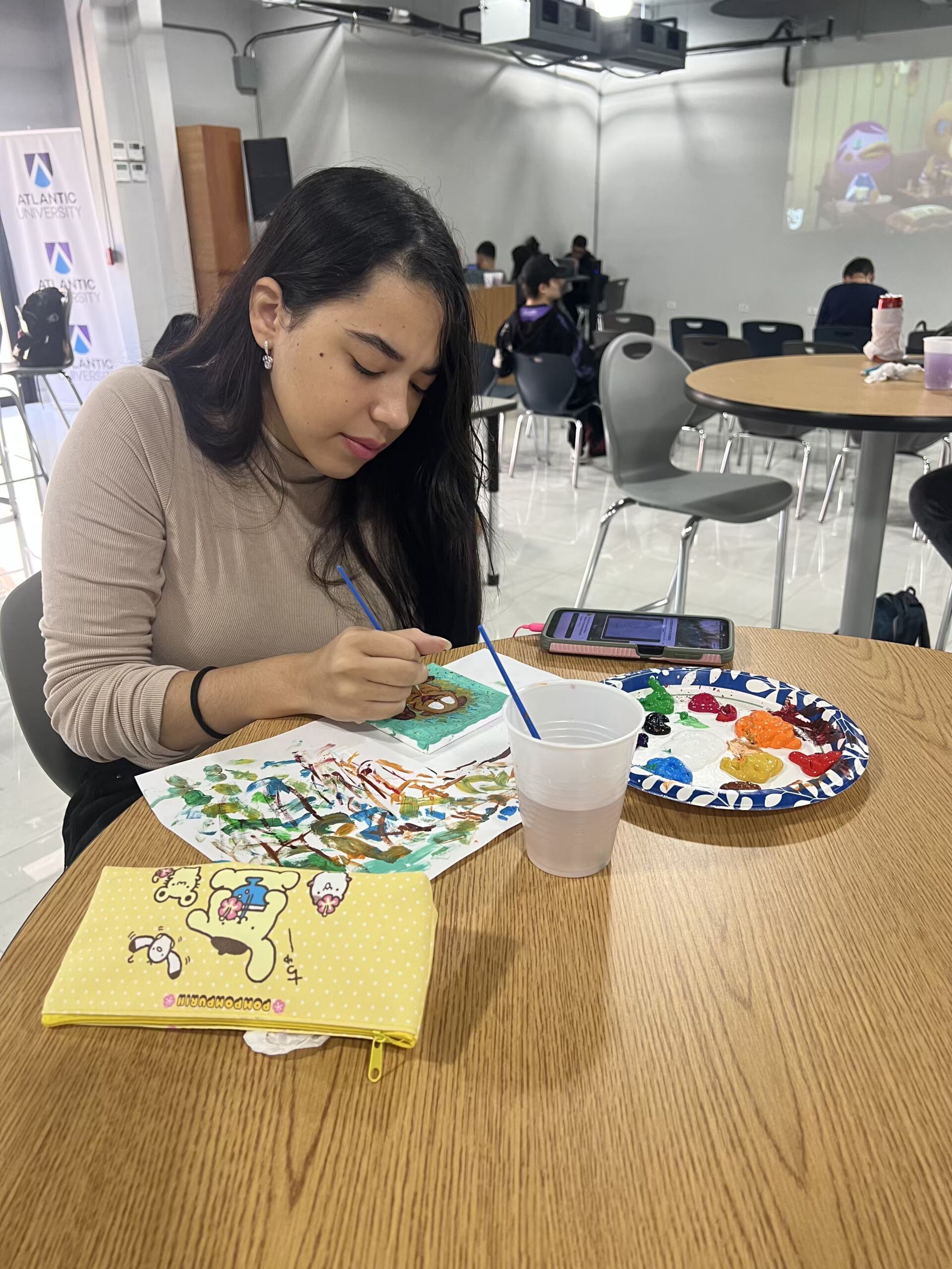 La celebración del World Art Day en el Centro de Estudiantes ofreció a la comunidad universitaria un espacio creativo y relajante durante la hora de almuerzo. A lo largo de la actividad, varios estudiantes se dieron cita para desconectarse de la rutina académica y reconectar con su lado artístico mediante la pintura en mini canvas.